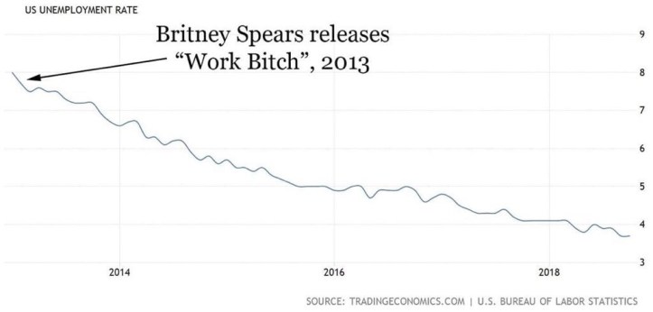 In conclusion, some people say that the Obama administration is the reason why the economy is so strong, other people say it is because of Trump. The truth of the matter is that the strong economy was caused by underlying market trends set into motion by “Work Bitch.” Do not mistake correlation with causation and give credit to them for Britney’s economy. The chart speaks for itself.
