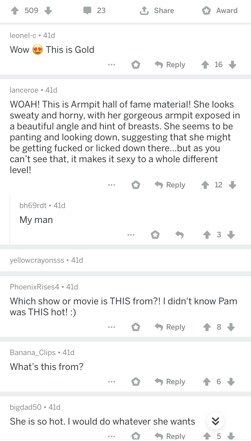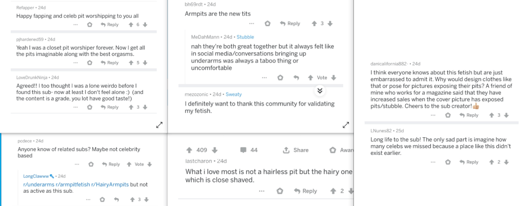 Whilst researching this blog, this filth repulsed me. It just makes me sick in the pit of my stomach. I really do not understand how someone can sexualize armpits. If someone is secretly part of this sub wants to tell me and explain what about an armpit gets the juices flowing, please, enlighten me, I will not judge you.
