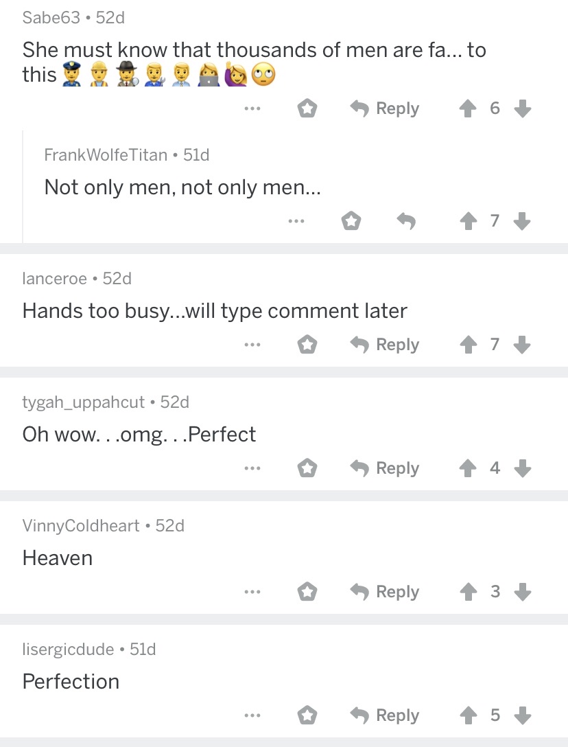 So this is it, the number one post of this 17,700 member community. Pretty innocent gif, only to be SEXUALIZED BY THESE VILE HUMANS. And if you think I’m overreacting by calling these people vile, read these comments and tell me you wouldn’t arrest every single person in this subreddit.