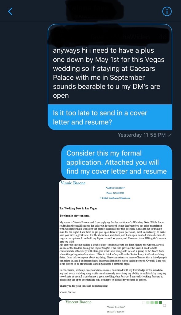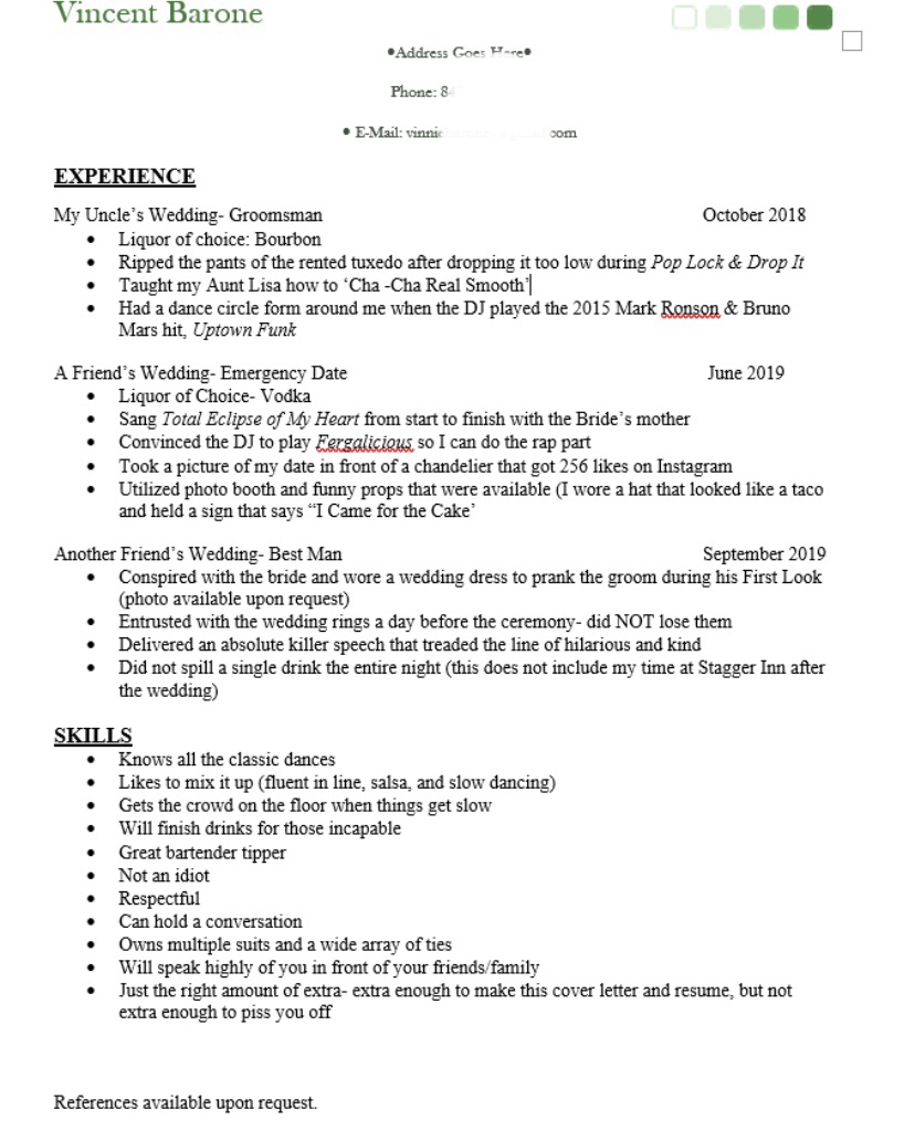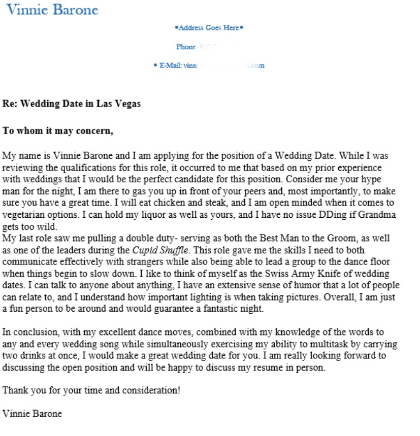Now, I’ve been to my fair share of weddings. I know that when you’re a wedding date as opposed to a guest, your responsibilities change. These people aren’t your family and friends, so you are not just representing yourself, you are representing the person who brought you too. Few people realize that when they are a wedding date, the night isn’t about them, it’s not even about the bride and groom, it’s about the person who brought you. To show this girl, I am the best-equipped to handle all duties that being a wedding date entails; I did what any potential candidate does when they want someone to see how qualified they are for a role- I sent in a resume and cover letter.