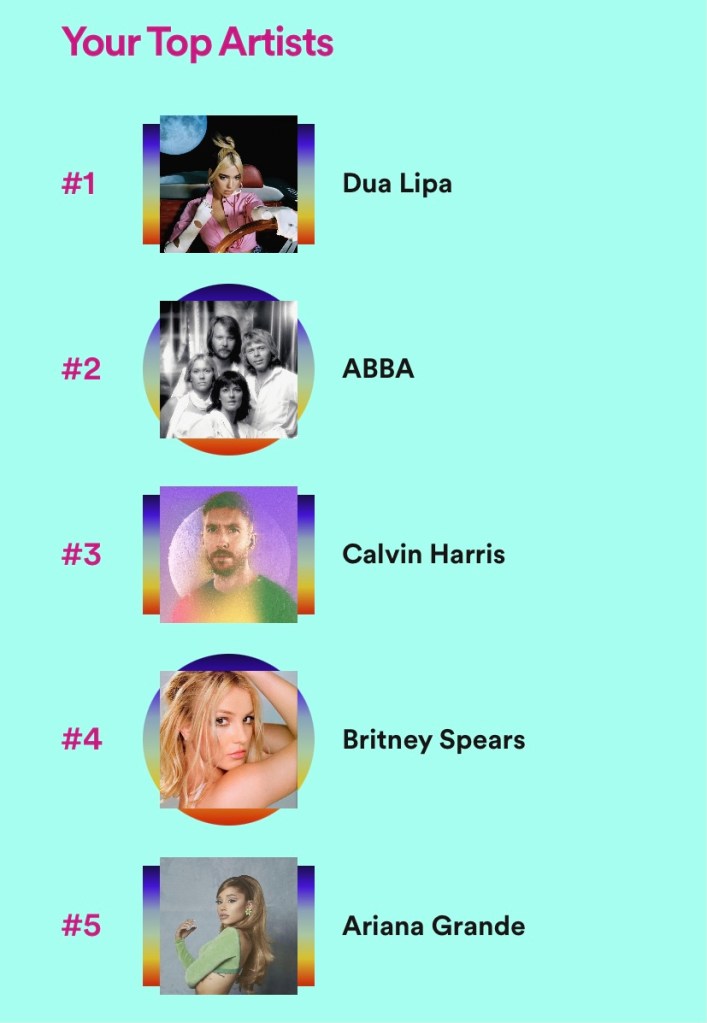 That is a good looking song-sandwich if I say so myself. I really like the fact that I have only had two top-songs in four years because it means if you nab the top spot, you are joining an exclusive club. This isn’t the NBA Hall of Fame where everyone who dribbled a basketball gets in, you have to be a FORCE to join these ranks. I consider my music taste elite, so it only makes sense that the Vinnie Barone’s Most Played Song Club is elite too. (Now taking name suggestions for this club). I am only going to briefly touch on the fact that ABBA has three of my top 5 because last month I wrote 2300 words about the group and how much I love them. ABBA Gold was on repeat throughout the year- nine songs from the album appear in my Top 100 Most Played Songs Playlist. However, despite all the ABBA I consumed this year, they couldn’t reign supreme in a year that Dua Lipa gave me an absolute MASTERPIECE of an album. I have achieved a lot of great things in my life, however, being in the top 1% of listeners of Dua Lipa in a year is one of the better things (I live a sad, sad life).